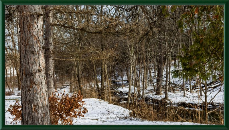 A streamlet courses through the silent woods, creating a peaceful backdrop for a hike.